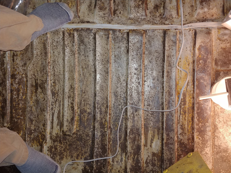Justin prepped the floor by grinding and scraping away as much paint and loose rust as possible. Then he used a rust converter (Corroseal) which turns black or bluish when in contact with oxidized medal, to slow the spread of the rust.
